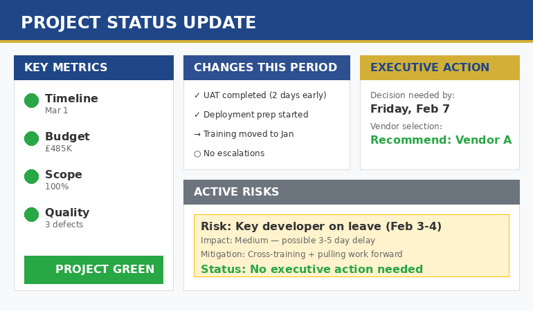This AI prompt template produces status updates executives can scan in 30 seconds.