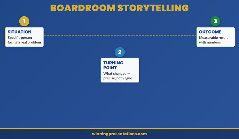 The mistake most presenters make is confusing storytelling with anecdotes. A boardroom story isn’t “let me tell you about a client.” It’s a structured device with three components: