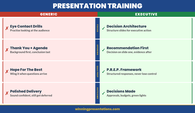 Most presentation training programmes teach generic public speaking. Eye contact drills. Breathing exercises. PowerPoint design principles. These aren’t wrong — they’re just irrelevant to what actually happens in executive environments.