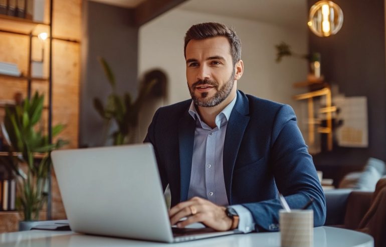Camera angle. A laptop camera positioned below eye level produces an unflattering upward angle. Raising the laptop — even with a stack of books — brings the camera to eye level. At eye level, the image is more natural and the eye contact with the camera feels more direct. This is a two-minute adjustment that changes how you appear on screen.